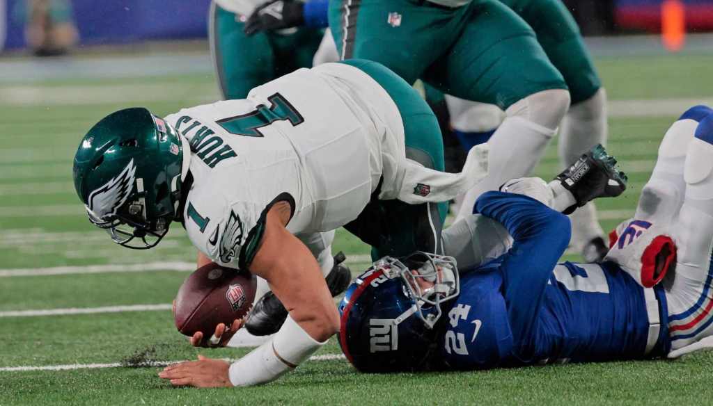 The Eagles — subsequently led by backup quarterback Marcus Mariota — finally got on the board with a field goal late in the third quarter, then cut the lead to 24-10 on a Mariota to Quez Watkins touchdown pass with 10 minutes remaining, but a Mason Crosby field goal on New York’s next drive with under four minutes to go made the game a three-possession gap once again to effectively ice it.