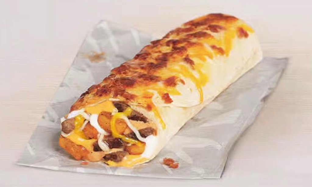 The Steak and Bacon Grilled Cheese Burrito features marinated, grilled steak, nacho cheese sauce, creamy chipotle sauce, potatoes, reduced-fat sour cream, and three-cheese blend wrapped inside a warm flour tortilla, with even more three-cheese blend and bacon grilled on the top.