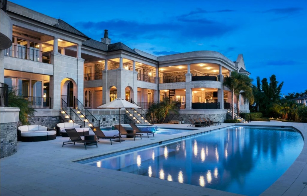 It is a 30,875-square-foot estate that was built in 2012 and sits on 1.25 acres. It has seven bedrooms, eight full bathrooms, eight half-baths, and almost 9,000 square feet of outdoor space that includes two boat lifts and an 80-foot-long pool.